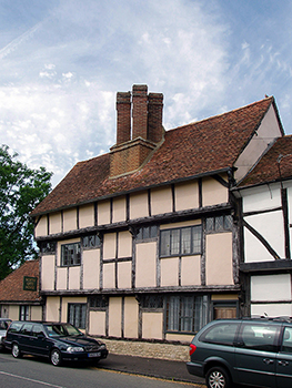 Coach in front of the George Hotel | Thatched cottage with hollyhocks |