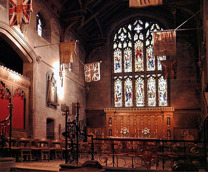 The two knightly effigies in the north wall of the Savage Chapel are fine examples of the pageantry of English monumental art. They are set together, end to end, with canopies that face the body of the church. One represents the Sir John Savage (the 5th) K.G., the the elder brother of Archbishop Savage. He commanded the left wing of the invading army at Bosworth Field in 1485 and was slain at the Siege of Boulogne in 1492. The collar of SS (Spiritus Sanctus) round the neck is a notable feature. he was succeeded by by his eldest son, John, whose effigy clad in plate armour with a shirt of mail, occupies the other canopied tomb. He died in 1527 and was Sheriff of Worcestershire for 24 years.